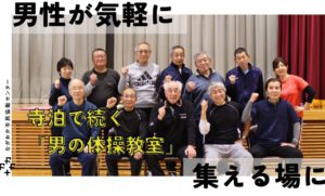 「男の体操教室」(寺泊地域)男性が気兼ねなく参加できるよう工夫された教室です。「男同士だからこそ気兼ねなく楽しめる」という参加者の声の通り、和やかな雰囲気の中でボッチャや健康体操が行われていました。
