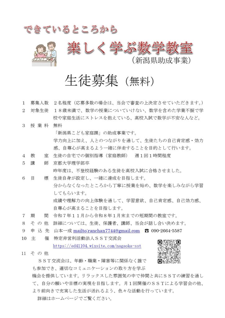 | 内容 | 「新潟県こども家庭課」の助成事業 対象 18歳未満で数学の授業日ていけない、数学を含めた学業不振で学校や家庭生活にストレスを感じている、高校入試が不安な人、など |