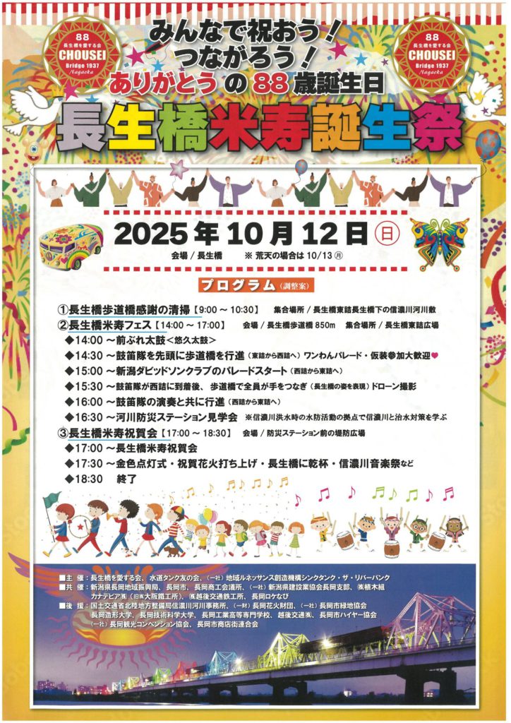 内容 | ① 長生橋歩道橋 感謝の清掃 ② 長生橋米寿 渡り初め 太鼓演奏・鼓笛隊行進・バイク&ワンわんパレード・ドローン撮影・防災ステーション見学など 渡り初めの参加者全員に「長生橋米寿記念缶バッチ」 をプレゼント! ※米寿の方には粗品も贈呈します。 ③ 長生橋米寿 祝賀会 金色ライトアップ点灯式・祝賀花火・乾杯・信濃川音楽祭 |