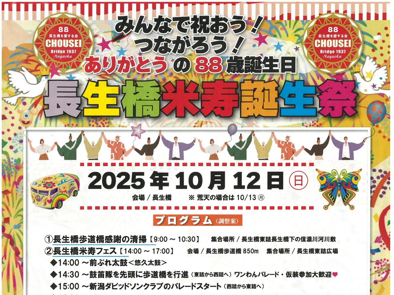 時間 | ① 長生橋歩道橋 感謝の清掃 9:00~10:30/集合:長生橋東詰 信濃川河川敷 ② 長生橋米寿 渡り初め 14:00~17:00/会場:長生橋歩道橋 ③ 長生橋米寿 祝賀会 17:00~18:30/会場:河川防災ステーション前 堤防広場 |