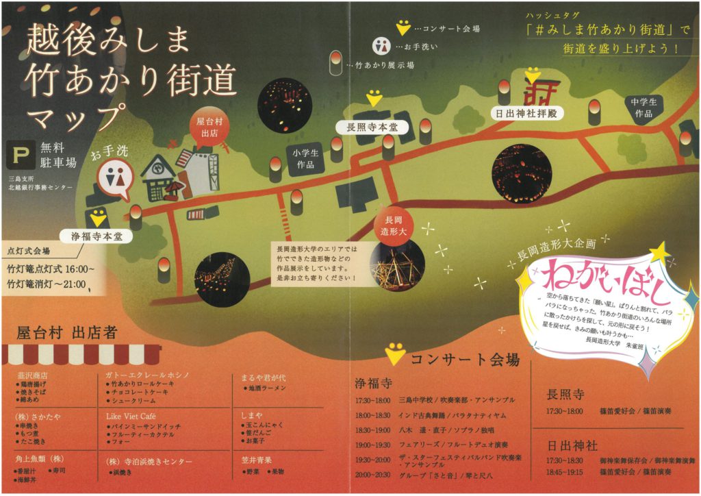 | 内容 | デザインを凝らした竹灯籠が約1kmの通りを照らす 屋台村、コンサート、ねがいぼし企画 等 |