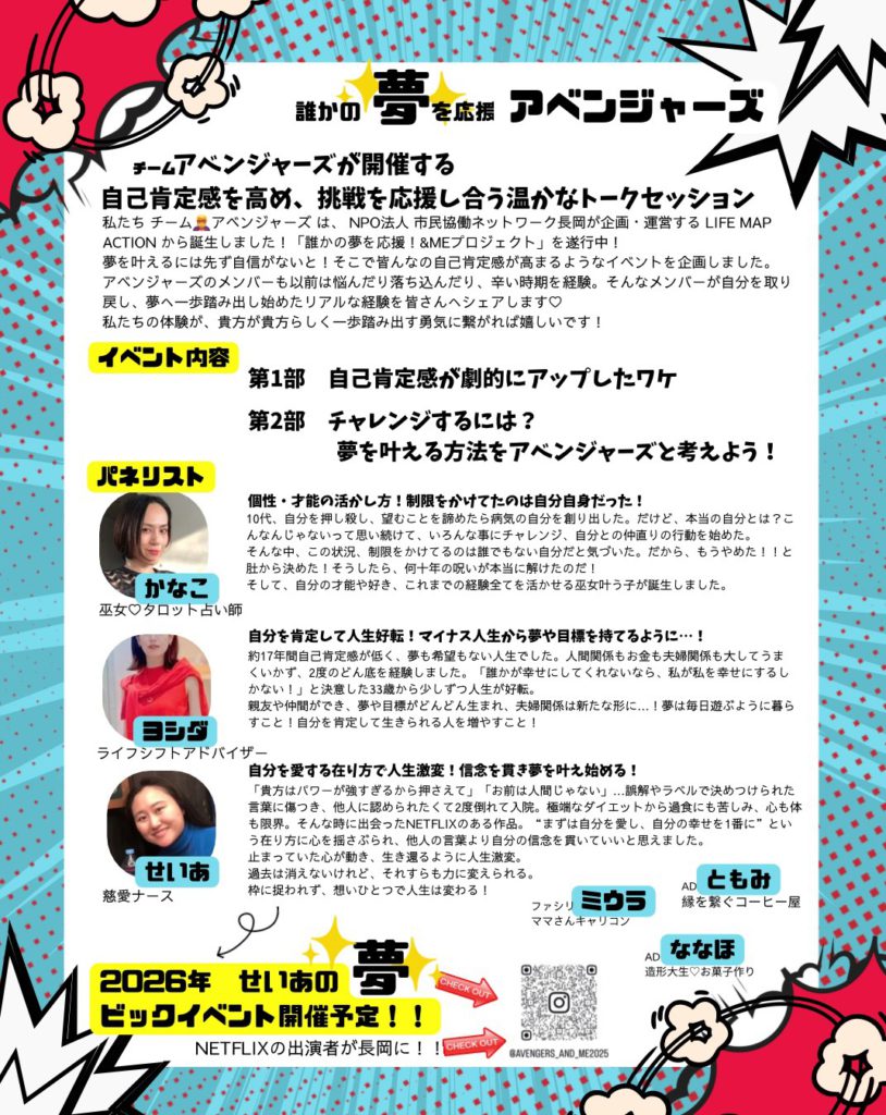| 内容 | 誰かの夢を応援したい想いから生まれたチームアベンジャーズのトークセッション! 第1部 自己肯定感が劇的にアップしたワケ 第2部 チャレンジするには? |