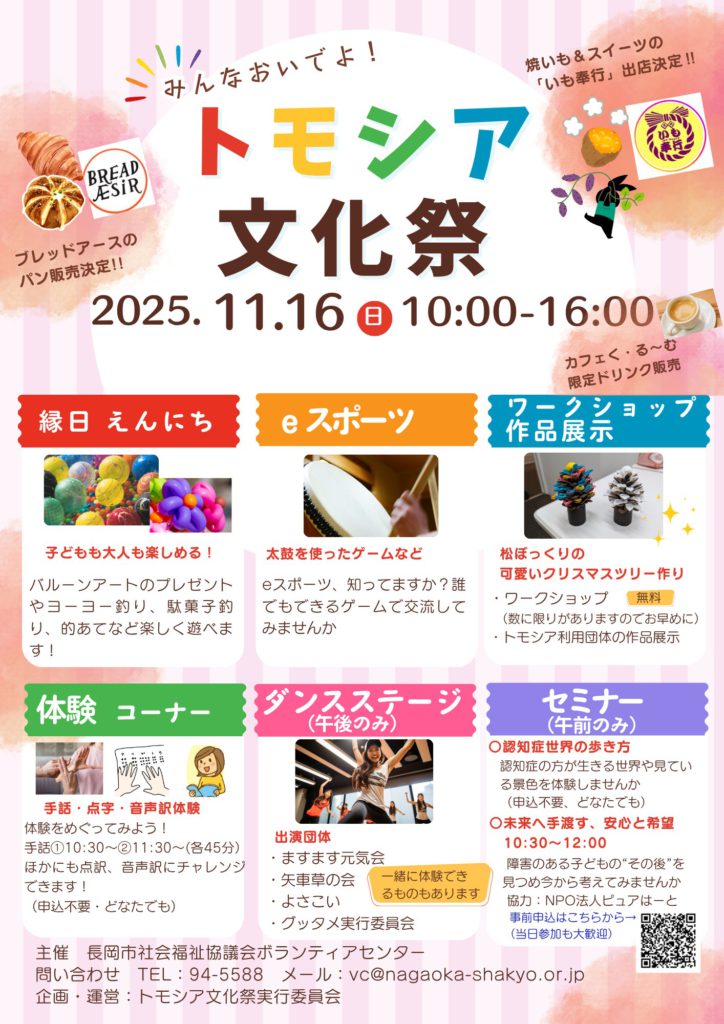 | 内容 | 縁日・eスポーツ・作品展示・ワークショップ・体験コーナー(手話・点訳・音声訳) セミナー<午前のみ>①認知症世界の歩き方②未来へ手渡す、安心と希望(事前申込制ですが当日参加も可) ダンスステージ<午後のみ>ますます元気会・矢車草の会・よさこい・グッタメ実行委員会 ♪おいもスイーツやパンの販売もあります♪ |