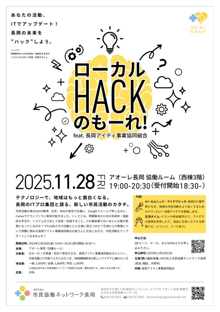 「ハック」とは、問題解決のための効率的・独創的な手法や、システムを工夫して改変・改造すること。ITの最前線では今どんなことが話題なのか、それが私たちの活動にどう役立つのか、日頃からIT事情について研鑽に努める長岡アイティ事業協同組合の皆さんと交流しながら、市民活動をアップデートしてみませんか?