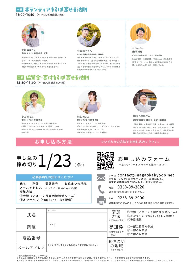 | 内容 | ボランティアと資金が集まると、活動がますます充実する。 市内2団体ずつ、計3団体より長岡の団体がボランティアや協賛を集めるときに工夫していることを事例発表を交え、トークセッション形式でお届けします。