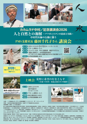 | 時間 | PMS支援室長「藤田千代子さん講演会」 上映会「荒野に希望の灯をともす~医師・中村哲現地活動35年の軌跡~」 |