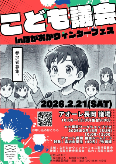 | 内容 | 地域の活性にこどもたちの意見を取り入れていきたい!そんな思いからながおかウィンターフェス2026で「こども議会」を開催。下の2点を発表します。 事前ワークショップでは、2つのことについて意見を出し合います。 |