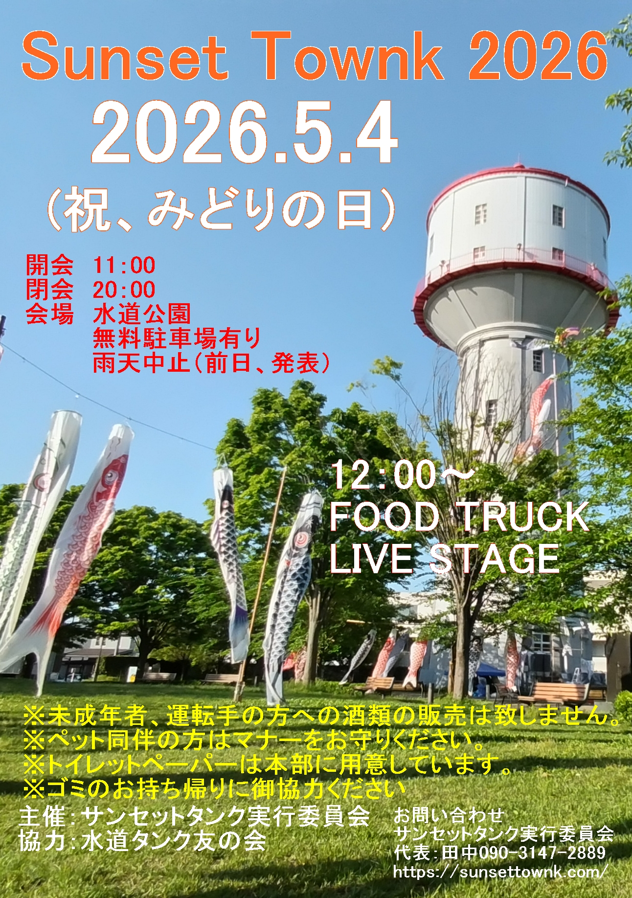 | 内容 | サンセット・タンクは毎年5/4と秋の2回、開催しています。水道タンク前のステージで音楽やダンスパフォーマンス、他にキッチンカーでの飲食の提供。今回は中島浄水場通水100周年の年で長岡市水道局様のブースも参加予定です。ご家族・お友達を誘って御来場下さい。 |