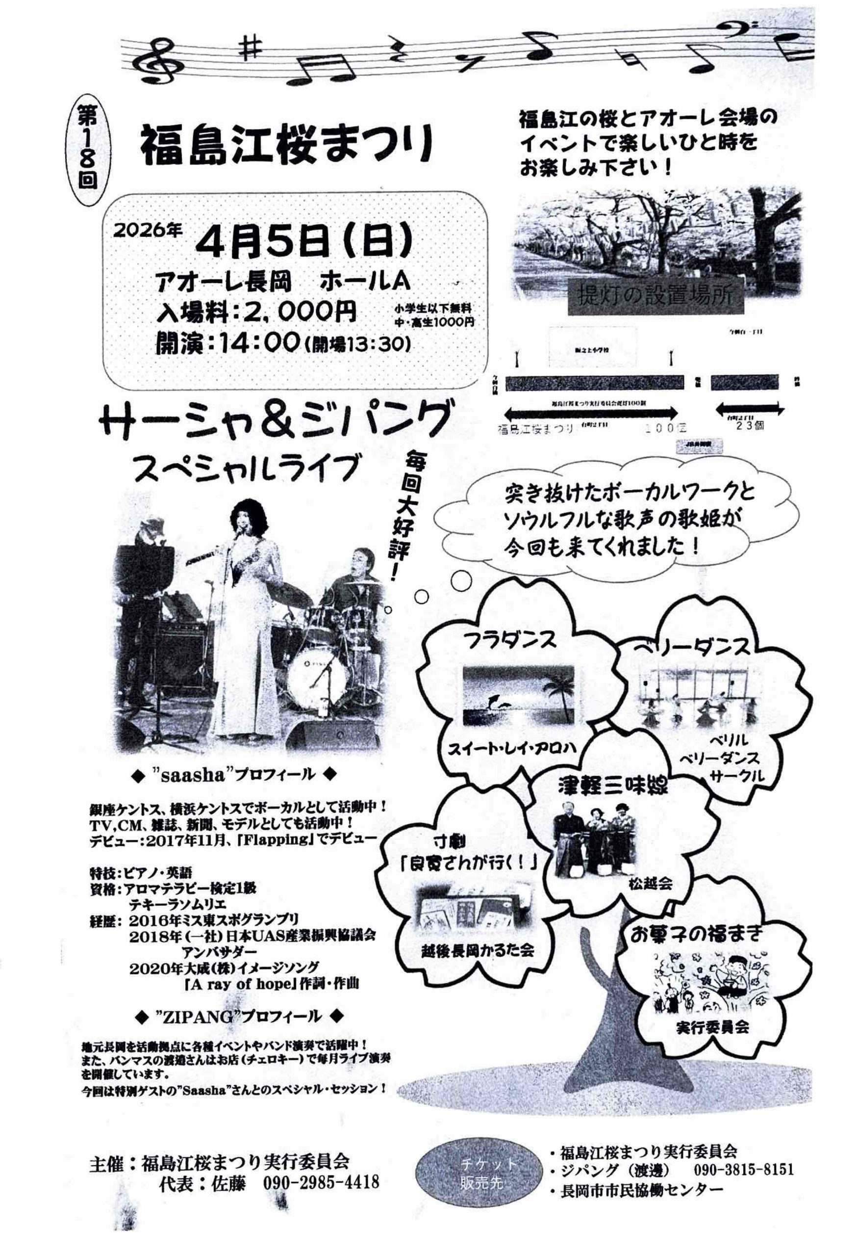 | 内容 | 地域の桜と多彩な芸能を楽しむイベント。実力派歌手saashaと地元バンドZIPANGによるライブ。他にもフラダンス、ベリーダンス、津軽三味線、寸劇「良寛さんが行く!!」に加え、お菓子の福まきも行われます。福島江の桜鑑賞と併せて、賑やかな春のひと時を楽しめます。 |