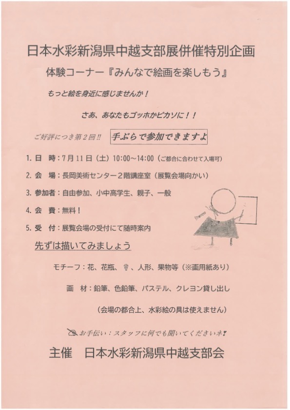 | 内容 | 日本水彩新潟県中越支部展併催特別企画。体験コーナー『みんなで絵画を楽しもう』。もっと絵を身近に感じませんか!さあ、あなたもゴッホかピカソに!!ご好評につき第2回!!手ぶらで参加できますよ。まずは描いてみましょう♪
