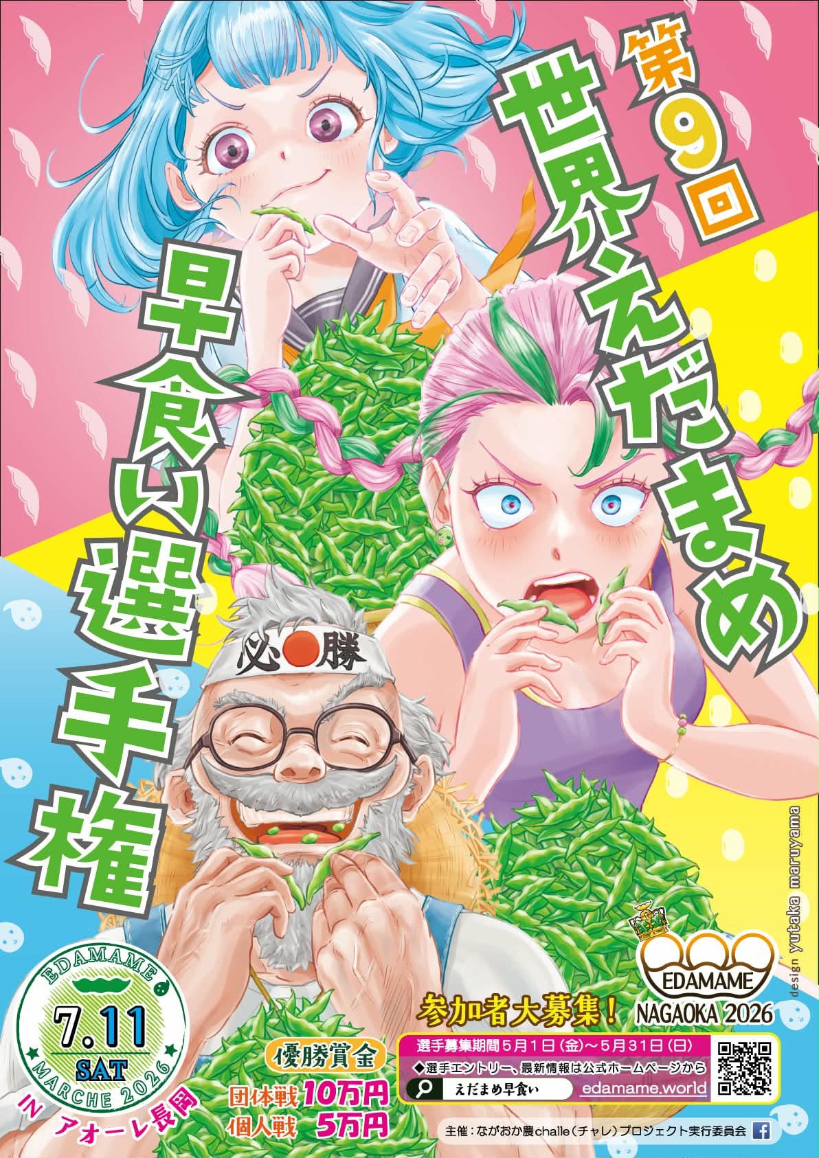 | 内容 | 日本随一の枝豆消費量! 皿に盛られた新潟ながおかの枝豆(個人:400g / 団体:1,000g)を100秒間で何グラム食べたかを競う国際競技大会。 |