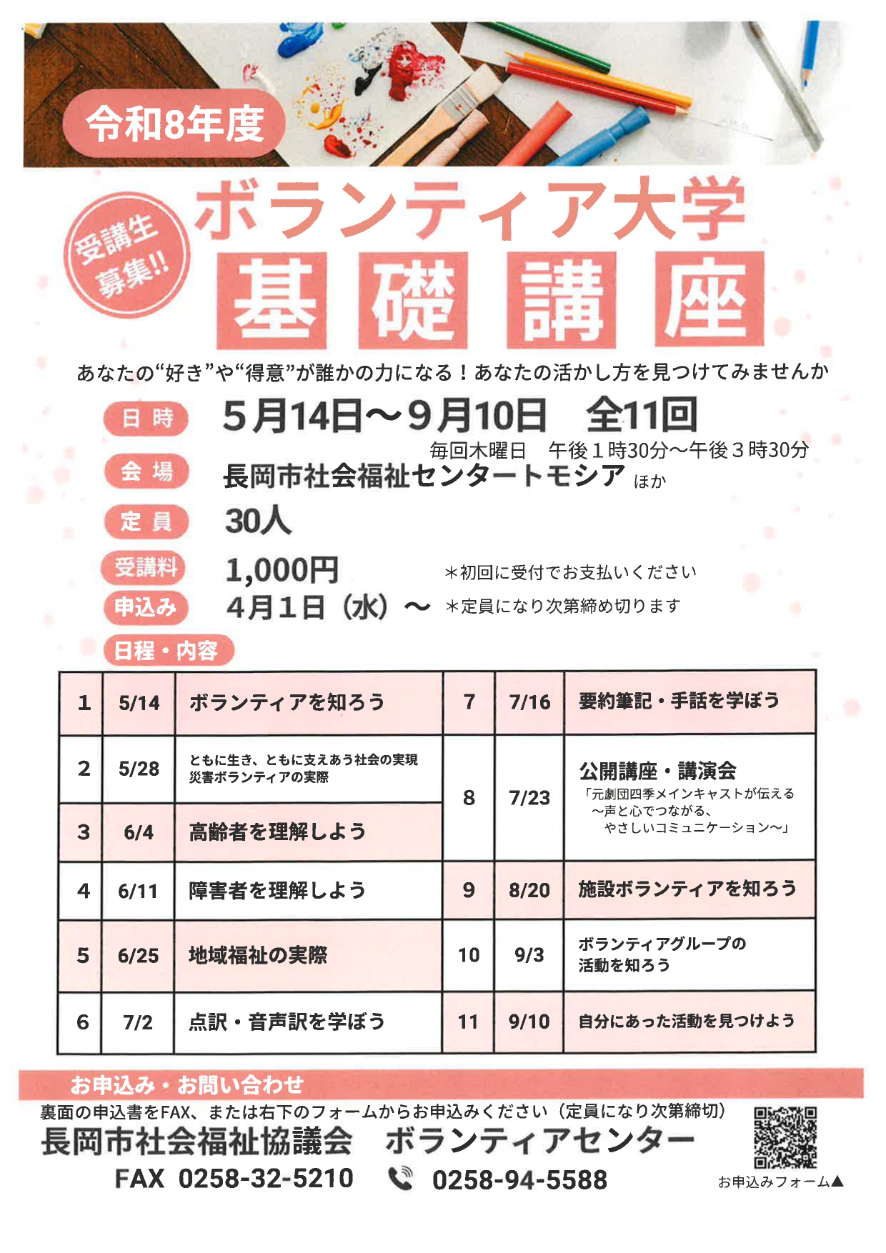 | お問い合わせ先 | 長岡市社会福祉協議会ボランティアセンター ☎ 0258-94-5888 |