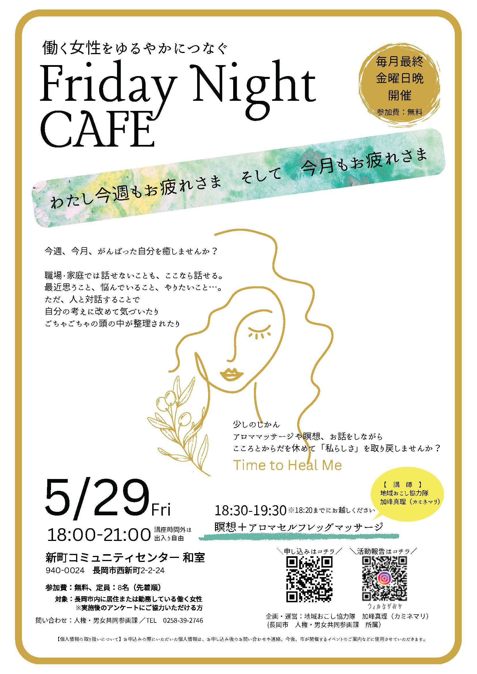 | 備考 | 瞑想+アロマセルフレッグマッサージ〈講師〉地域おこし協力隊 加峰真理 |