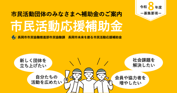 長岡の未来を考え、その実現のために主体的に取り組む活動を応援する「未来を創る市民活動応援補助金」の令和8年度募集を開始しました。