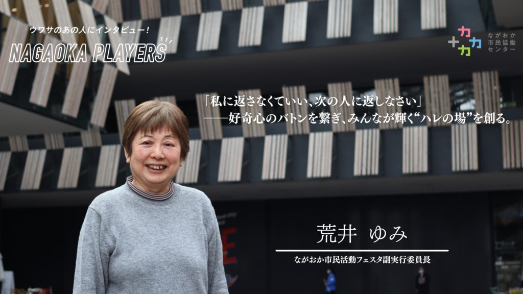 長岡市の市民活動を語る上で欠かせないイベント「市民活動フェスタ」。その副実行委員長として、長年パワフルに活動されているのが荒井ゆみさんです。新潟市から長岡へ移り住み、子育てをきっかけに地域へと飛び出した荒井さん。その歩みには、ある大切な言葉と、尽きることのない好奇心がありました。