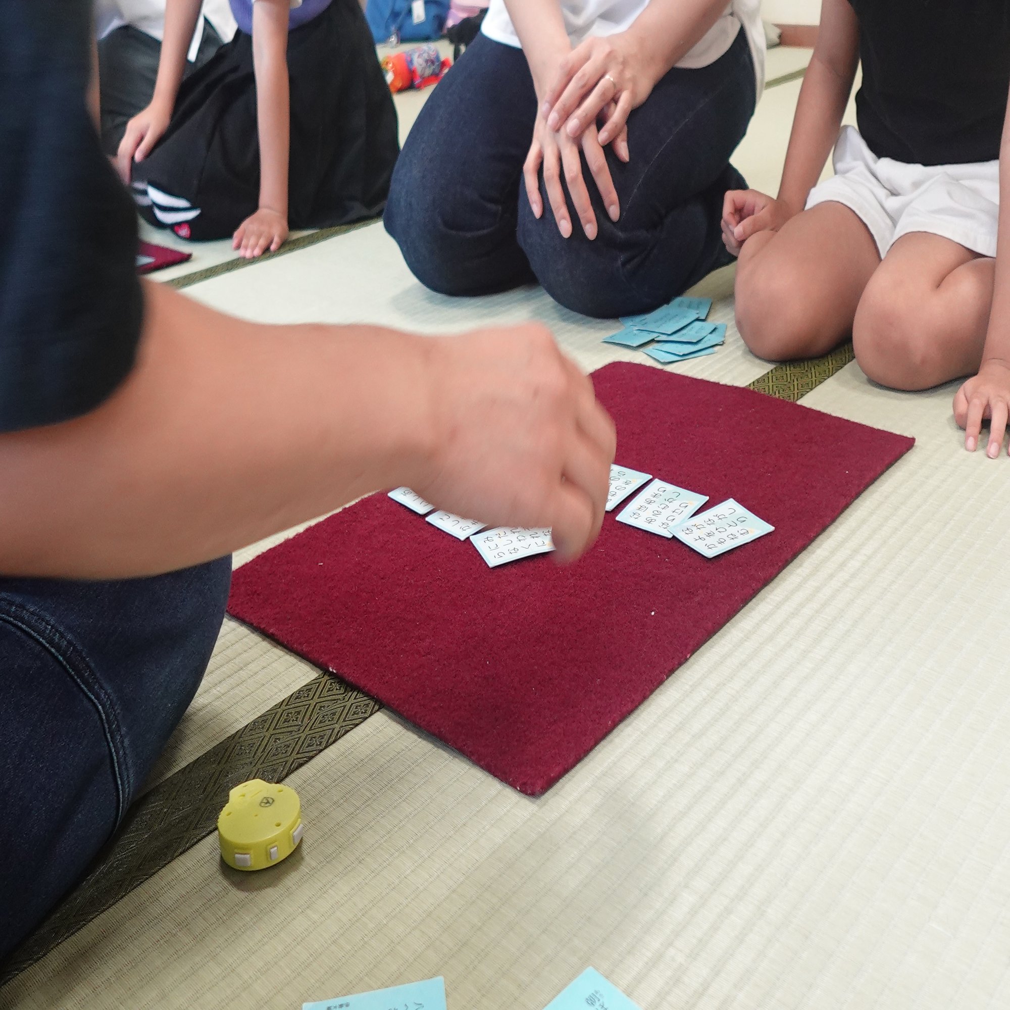 やり方は簡単。札を9枚並べてストップウォッチをスタート。一枚ずつ自分の後ろに札を取っていく、その秒数を記録していきます。と言っても初心者の私から見てもめっちゃズルして新記録を叩き出している子たちもいる和やかな練習でした。