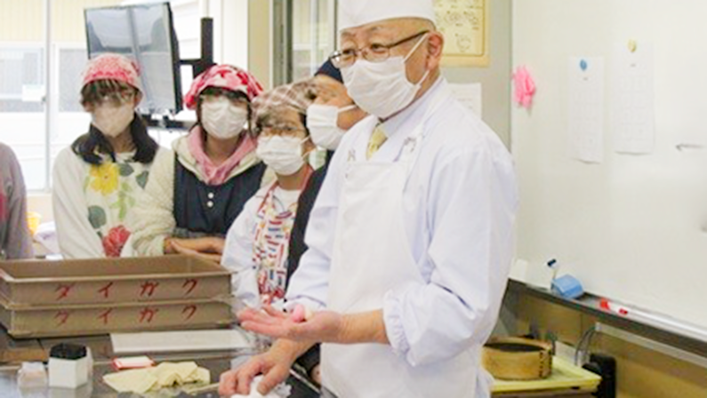 - 目標4: 質の高い教育をみんなに 県内外の高校や職業能力開発センターで、和菓子製造に関する出張授業を行っています。