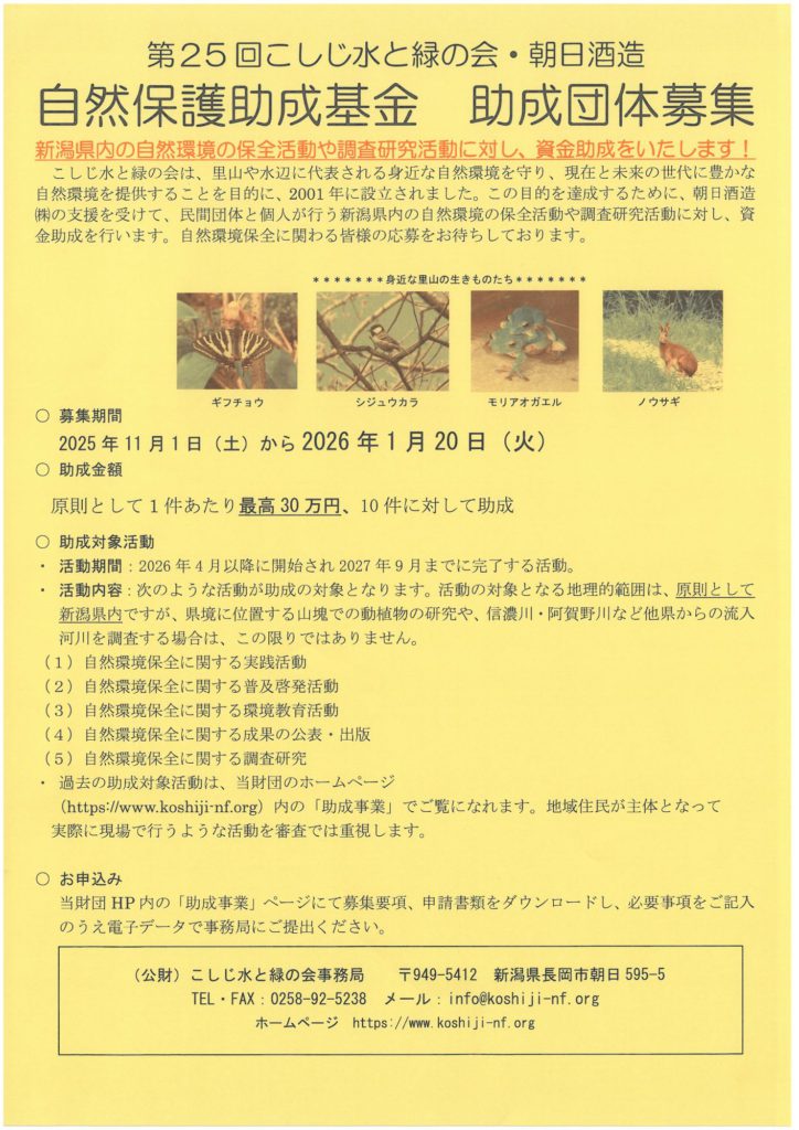 | 名称 | 第25回こしじ水と緑の会・朝日酒造「自然保護助成金」助成団体募集 |