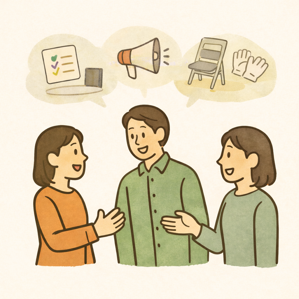 だからまずは、「次のイベント1回だけ、一緒に運営を手伝ってほしい」「当日の準備から片付けまで、1回だけ入ってほしい」など、できるだけ“関わりしろ”を限定して頼んでみましょう。受付・会場設営、チラシ配りなど、役割を1つに絞るのもおすすめです。